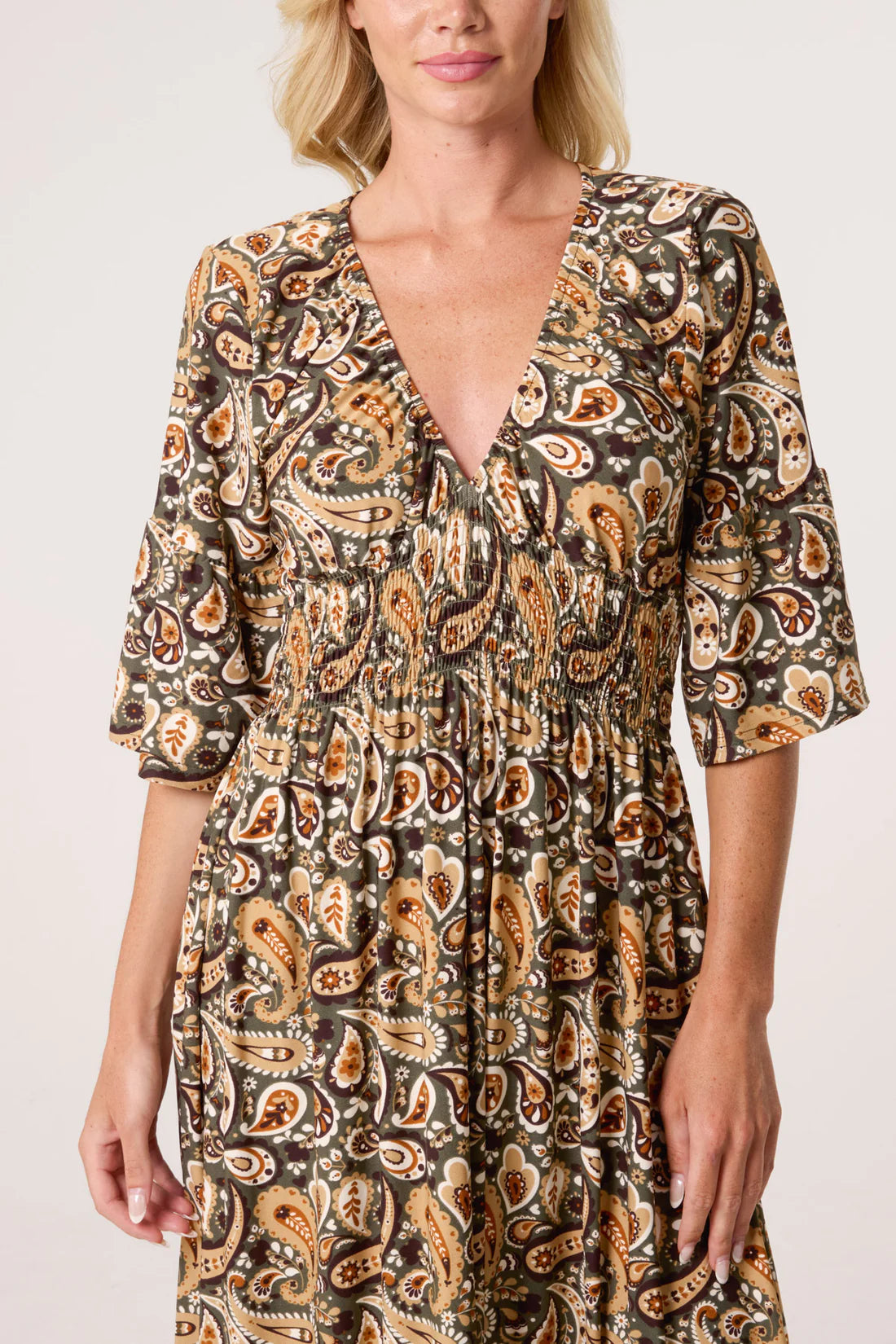 * Emilia Magic Dress - Stretch Maxi dress in greens and browns.